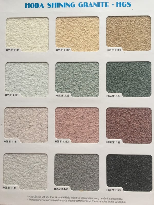– Những dáng vẻ của sơn đá Hoda Shining Granite phụ thuộc kích cở của đầu vòi phun, áp lực hơi, và khoảng cách từ sung phun đến bề mặt kiến trúc.